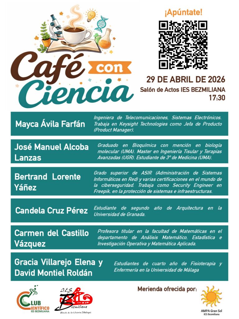 La actividad “Café con Ciencia” es una mesa redonda dinámica en la que profesionales y estudiantes de ámbitos científicos y tecnológicos comparten sus experiencias para orientar a nuestro alumnado. En un ambiente cercano y participativo, los estudiantes pueden plantear dudas y conocer de primera mano distintas trayectorias académicas y salidas profesionales, lo que contribuye a despertar vocaciones y a ofrecer una visión más realista y accesible del mundo de la ciencia y la tecnología.